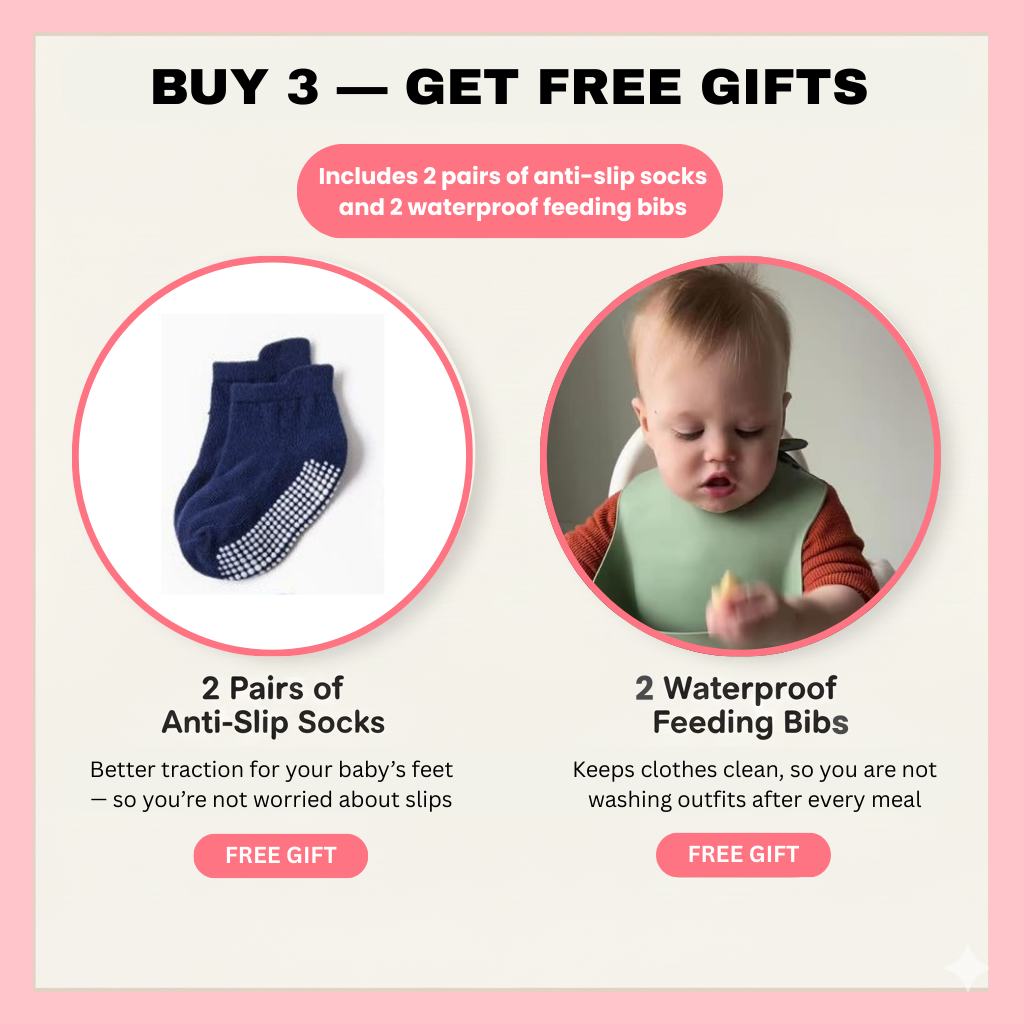 Fully adjustable straps give a secure fit for babies of all sizes without limiting movement. They stay put through every wiggle and play moment, and are comfy enough that your baby barely notices them.